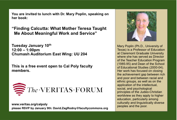 Faculty Commons SLO is looking forward to hosting Dr. Mary Poplin on Tuesday January 10 as part of the 2012 Veritas Forum. Dr. Poplin will be speaking on her experiences with Mother Teresa and her subsequent book Finding Calcutta: What Mother Teresa Taught Me About Meaningful Work and Service (2008, IVP).
