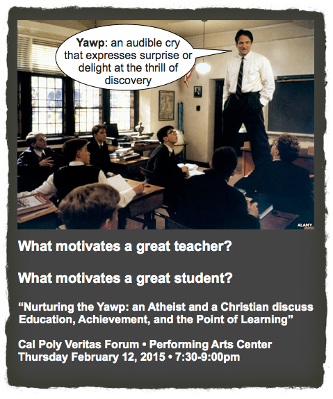 2. Veritas Forum Evening Program: Thursday evening February 12, 2015 7:30-9pm in the Performing Arts Center featuring Dr. Francis Su (Mathematics, Harvey Mudd College) dialoguing with Dr. Kenneth Brown (Philosophy, Cal Poly) on “Nurturing the Yawp: an Atheist and a Christian discuss Education, Achievement, and the Point of Learning.” The discussion will be moderated by Associate Vice Provost Dr. Albert Liddicoat (Electrical Engineering, Cal Poly) and will be followed by Q&A from the audience. This event is free and open to all Cal Poly students, faculty, and staff.