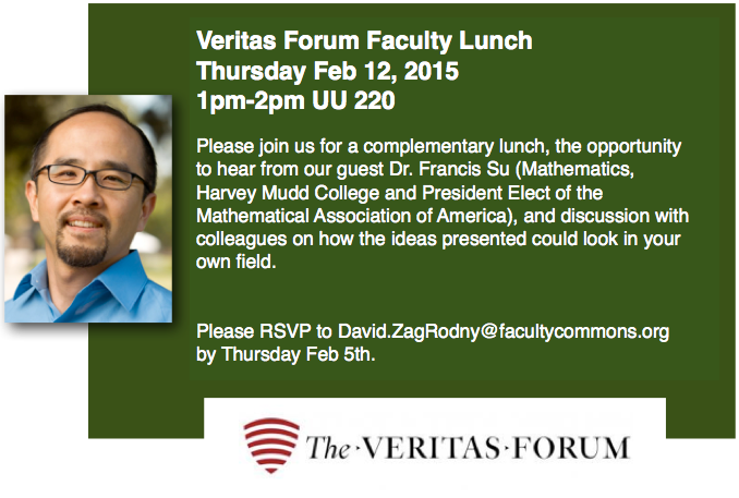 Thursday, February 12th 1-2pm in UU 220 the Veritas Forum is hosting a welcome lunch for faculty with our guest Dr. Francis Su.