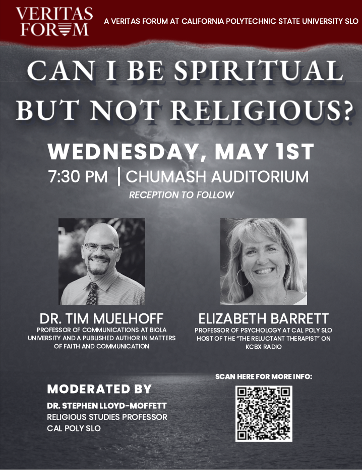 This past Spring, the Veritas Forum was back at Cal Poly. Many thanks to presenters Tim Muehlhof (Communication Studies, Biola University) and Elizabeth Barrett (Cal Poly, Psychology and Child Development) and our moderator Stephen Lloyd-Moffett (Cal Poly, Religious Studies), as well as everyone who worked to bring back this outstanding annual event.