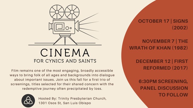 Please join us for a film series entitled “Cinema for Cynics and Saints” at Trinity Presbyterian (1301 Osos St), this Fall. Hosted by Professor Paul Marchbanks, we’ll gather 6:20-6:30 p.m, offer some introductory comments 6:30-6:35 p.m., screen the film, and then follow up with discussion.